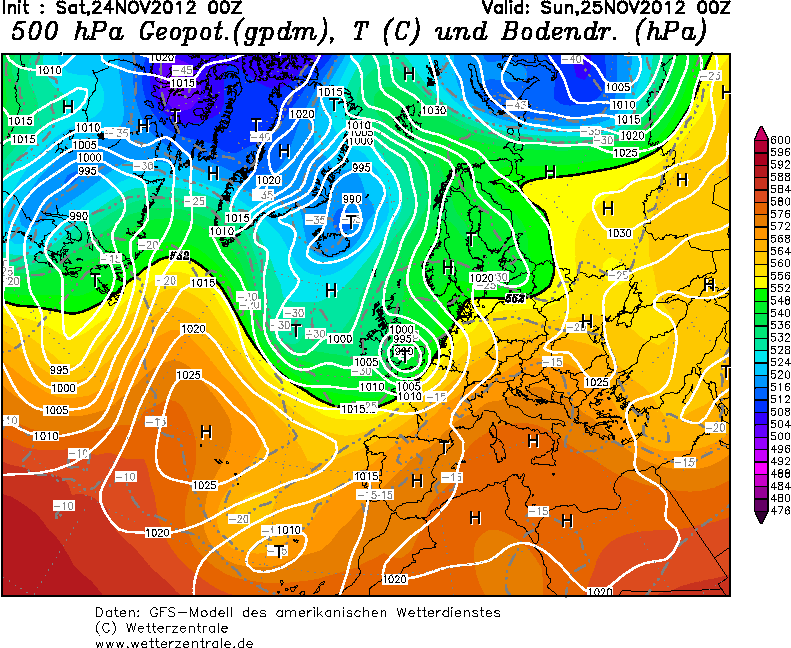 Carte isobares du 25 novembre 0Z sur wetterzentrale.